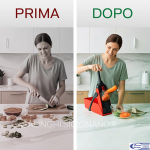 Il design ergonomico con impugnatura antiscivolo assicura un controllo stabile durante l’uso, mentre il sistema di sicurezza integrato con protezione per le dita riduce il rischio di tagli accidentali. Il contenitore di raccolta incluso mantiene il piano di lavoro ordinato e facilita la raccolta degli alimenti affettati.